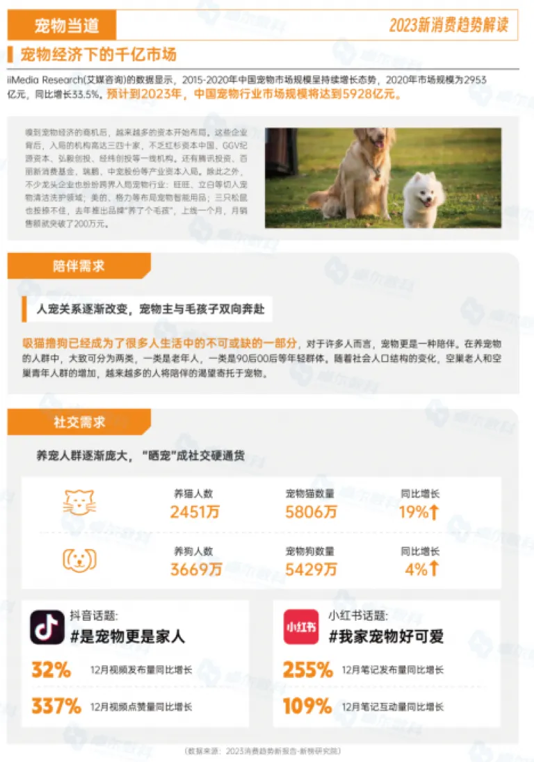 据艾媒咨询数据显示,预计到2023年,中国宠物行业市场规模将达到5928亿元,人宠关系逐渐改变,宠物主与毛孩子双向奔赴,养宠人群逐渐庞大,“晒宠”成社交硬通货。