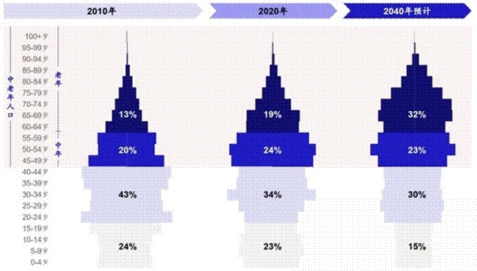 中国人口金字塔的形状逐渐从塔状向柱状转变,人口预期寿命延长和生育率走低,各年龄段人口数量逐步向高位年龄更多转变。2040年中老年人口占比预计将达到总人口的55%,相较于2010年增加22%。