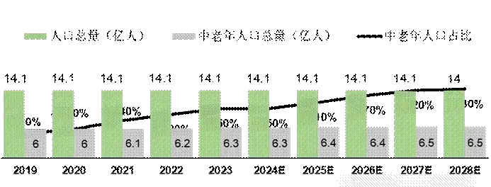 我国人口总量下降,标志着已经进入了人口负增长的时期。由于出生人口减少及生育率降低,我国人口在2022年出现1960年代以来的首次负增长。中老年人口占比预计逐步提高,我国中老年人口从2019年的6.0亿人增长至2023年的6.3亿人,预计于2028年增长至6.5亿人,届时中老年人口占比将提高至46.3%。