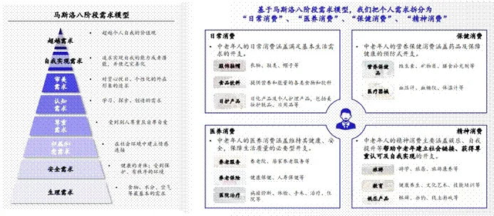 中老年群体的需求除了日常消费、医养消费和保健消费外,其对于精神层面的需求也至关重要。基于马斯洛需求理论,银发经济需求可分为日常消费、医养消费、保健消费和精神消费四个层次。