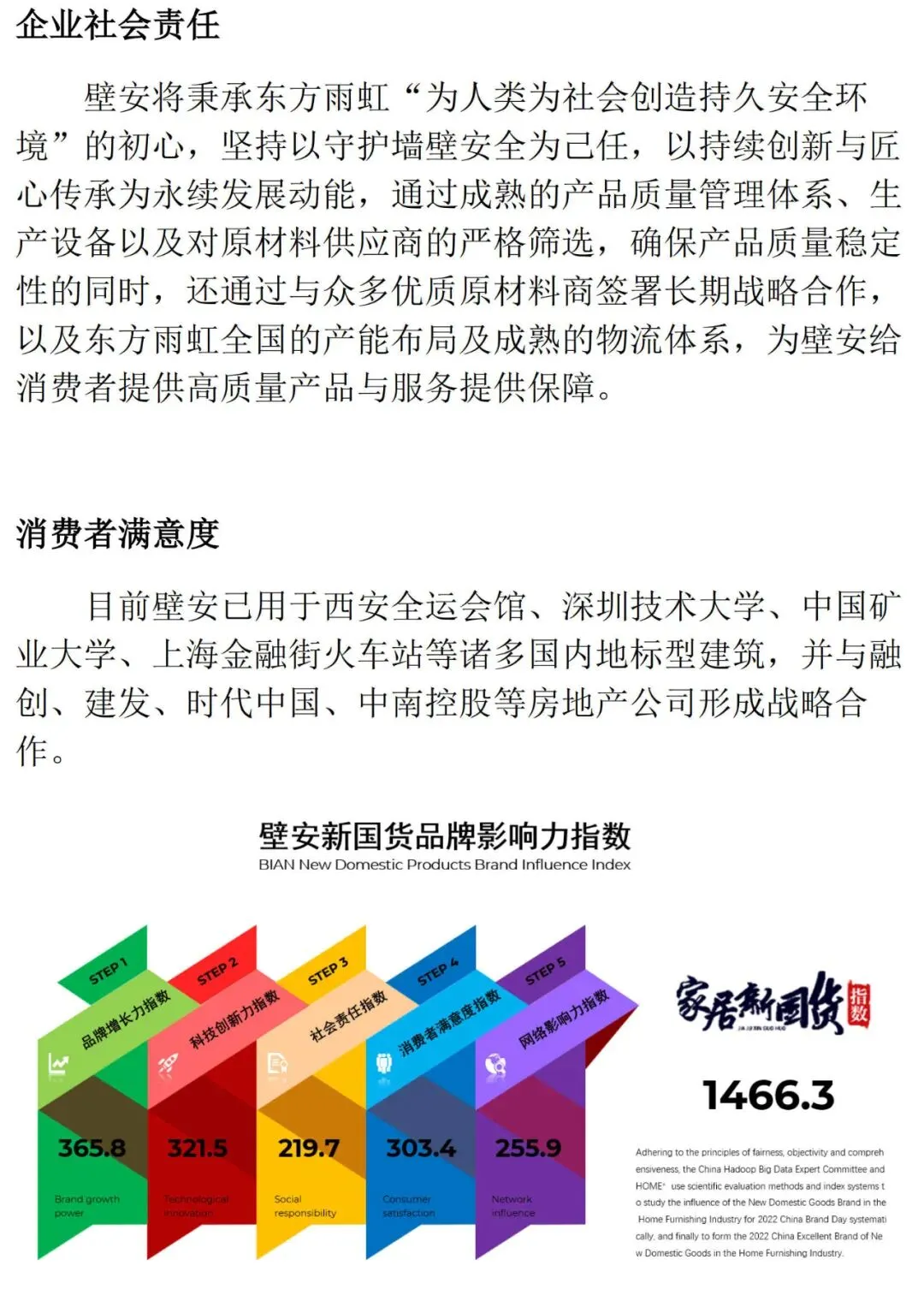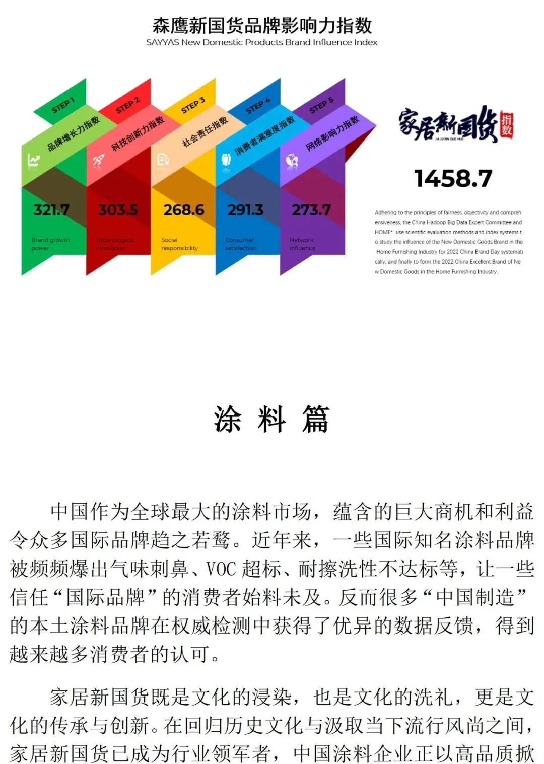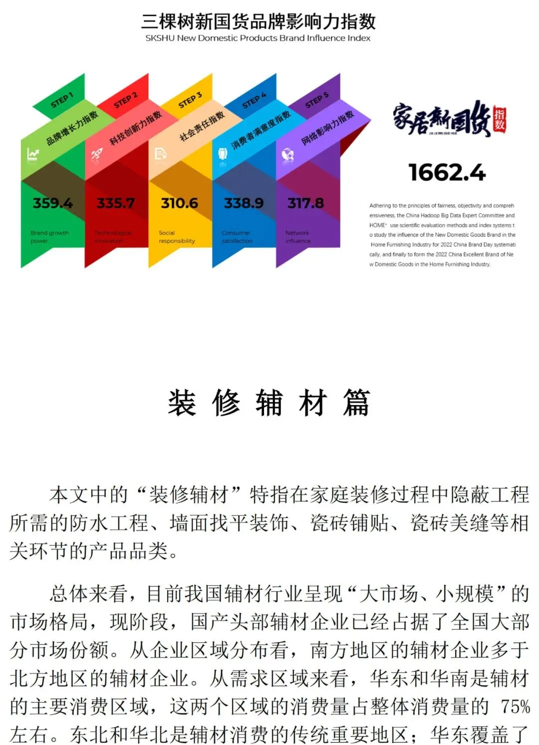 1、国家市场监督管理部门、各地消费者协会等公开、发布的信息和数据。3、家居建材行业协会、学会及业内专家等社会组织公开、发布的信息和数据。5、媒体平台及财经投资平台公开、发布的内容和数据。6、开发商、家居建材企业代理商、设计师、消费者等调研数据。“2022年第三届家居新国货品牌指数研究报告”以品牌增长力、品牌网络影响力、科技创新力、企业社会责任、消费者满意度等多个维度进行调研,汇集各方观点,通过定量与定性的分析方法,最终得出“2022年家居新国货品牌影响力指数”及“2022年家居新国货领军品牌”。