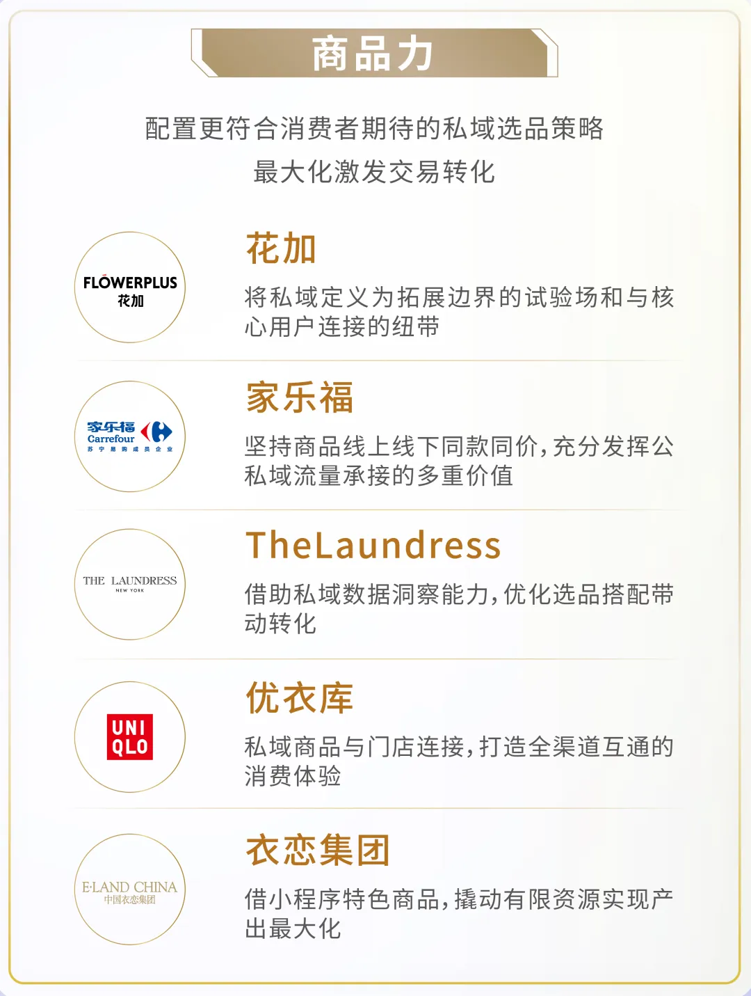 此次T+品牌私域价值榜通过评审团对四项基础能力“组织力、运营力、商品力、产品力”的科学评估,推出专项成绩突出的前20名品牌,从单点突破到全面发展,越来越多的品牌在私域创新的道路上持续勇猛精进。