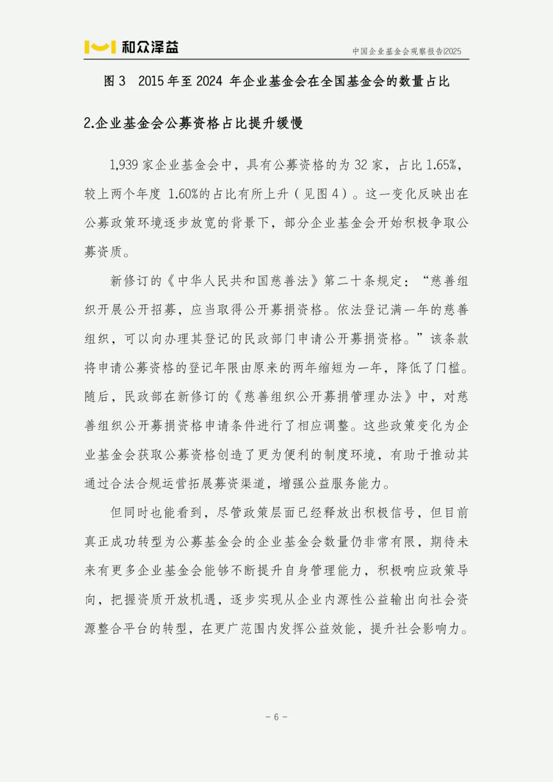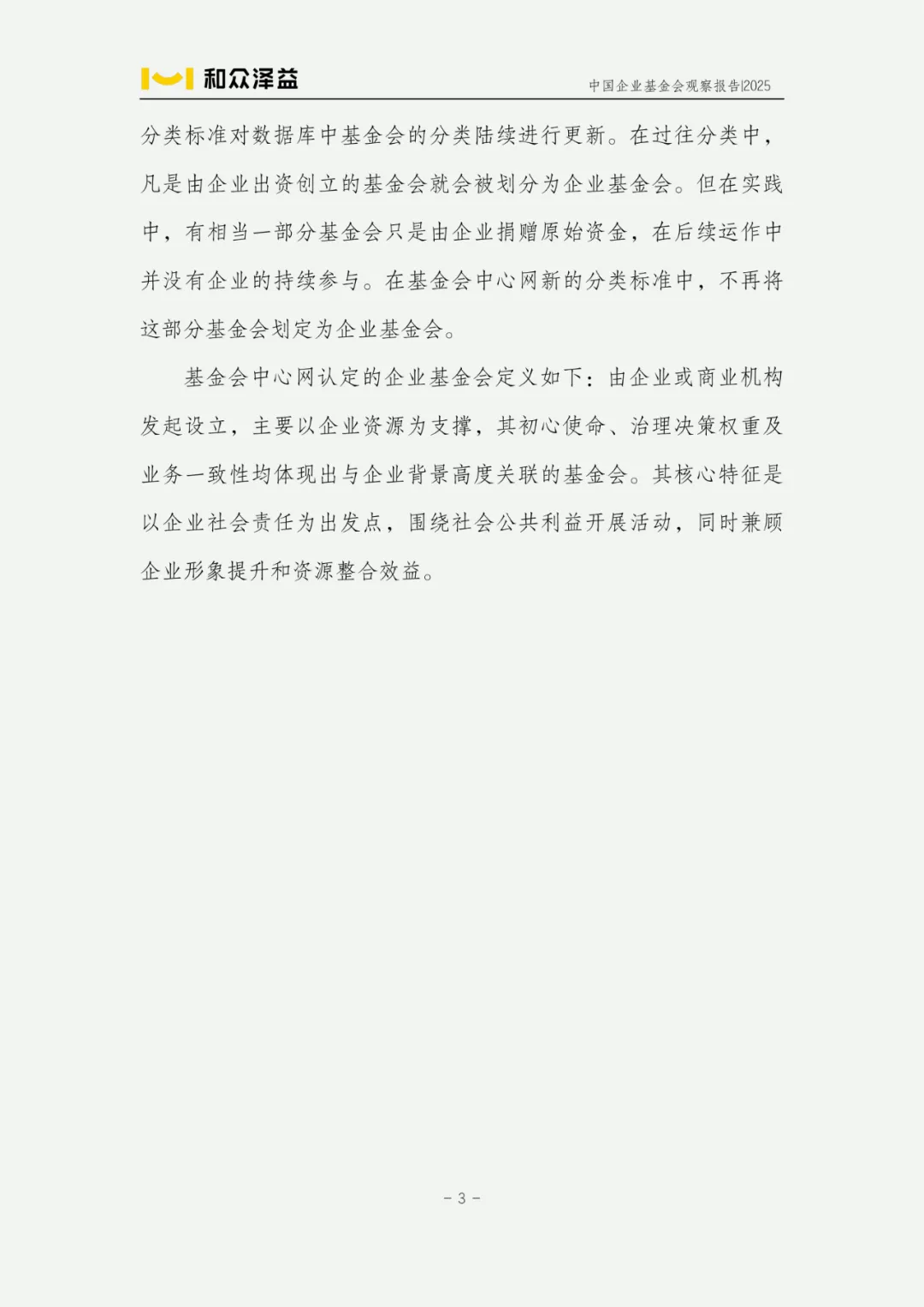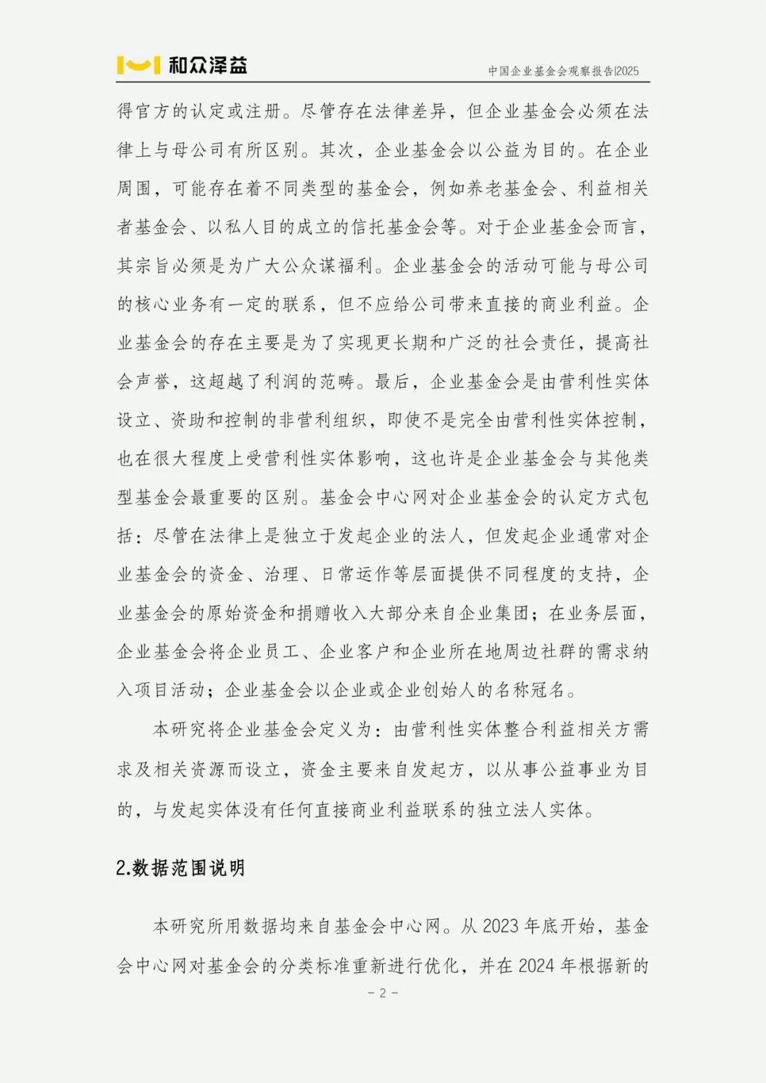 中国企业基金会观察报告(2025)聚焦企业基金会的发展现状与趋势,从政策引导、实践探索和行业动态三个维度展开分析。在高质量发展背景下,企业基金会作为企业履行社会责任的重要载体,其战略价值日益显现,成为推动社会公益、资源整合与社会治理的重要力量。行业发展节奏有所放缓,部分机构面临资源约束、能力短板及成效评估等挑战,但也迎来转型与沉淀的关键阶段。过去一年,企业在政策支持与内部动力的双重驱动下,展现出更系统化、专业化的运作能力。报告通过三年数据的纵向对比,揭示企业基金会的发展轨迹与阶段性特征,识别现存问题并研判未来方向。同时,新增“实践案例”板块,选取六家代表性企业基金会,深入分析其在战略定位、资源整合、收入拓展与价值创造方面的经验,为行业提供可借鉴的路径与模式。企业基金会应进一步强化战略定位,推动社会责任与主营业务深度融合,主动融入国家发展大局,在第三次分配中发挥更大作用。同时,鼓励探索社会创新模式,成为企业参与社会治理的有效桥梁。