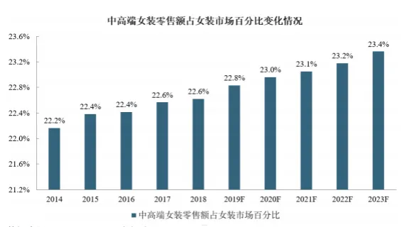 1.3在女装中,高端女装市场份额占比持续提升,且高端女装品牌集中度要高过大众女装品牌。原因是随着经济增长,中产消费群体会增大,消费者对品质要求提升,高端女装产品风格变化,新型面料运用等多重因素,使得高端女装市场有较为稳定的规模。同时高端女装市场渠道较为单一(主要高端商场),品牌数量远远少于大众女装品牌,市场集中度要高。