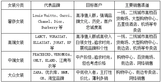 2.1区分女装有很多维度,按风格区分,按快时尚分,但区分女装最核心维度还是价格。价格高低决定了一个服装品牌消费群体,面料选择,款式设计和销售渠道等,按价格可以把女装分为奢侈女装,高端女装,中端女装和大众女装。如奢侈和高端服装品牌一般款式不多,面料讲究品质感强(DIOR、MaxMara),门店经常会出现在恒隆、国金、杭州大厦等商场。而大众女装因消费群体广,销售渠道在购物中心,线上进行销售(如ZARA、优衣库)。