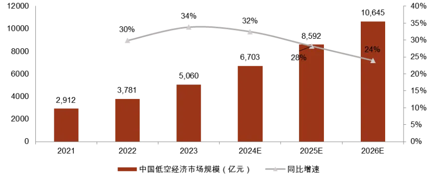低空经济市场空间广阔,中国增速高于全球。全球市场方面,根据前瞻产业研究院,2024年全球低空经济核心产业市场规模达到2.32万亿元,对应同比增速为11.5%。预计2029年全球低空经济规模将有望达到4万亿元,CAGR为11.5%。中国市场方面,根据工信部赛迪研究院预计,2024年中国低空经济市场规模达6,702.5亿元,其中低空制造和运营服务占市场规模的55%,低空基础设施和飞行保障的市场潜力尚未显现,同比增速为32.5%,增速高于全球。预计2026年中国市场规模有望达10,644.6亿元,CAGR达28.1%。