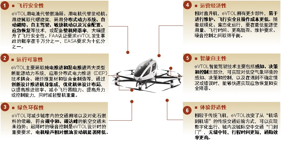 eVTOL航空器大量采用新兴技术,如分布式电驱、智能驾驶飞行/自动驾驶、更高的安全设计冗余、整机轻量化设计、高能量密度和安全等级电池技术、降噪技术等。