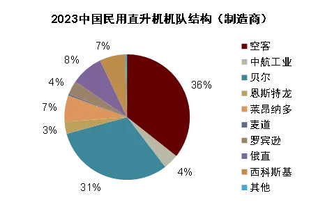 2023年亚太民用涡轴直升机机队规模达4130架,空客、贝尔等海外厂商占据主要市场。截至2023年末,亚太地区存量涡轴直升机机队主要由空客、贝尔、莱昂纳多、西科斯基等海外巨头占据主要份额,分别为41%/29%/11%/5%,中航工业集团占比为0.7%;按任务类型分,多用途直升机占到直升机总量的56%;按尺寸类型分,轻型单发直升机和中型双发直升机分别占54%/21%,占据主要份额。