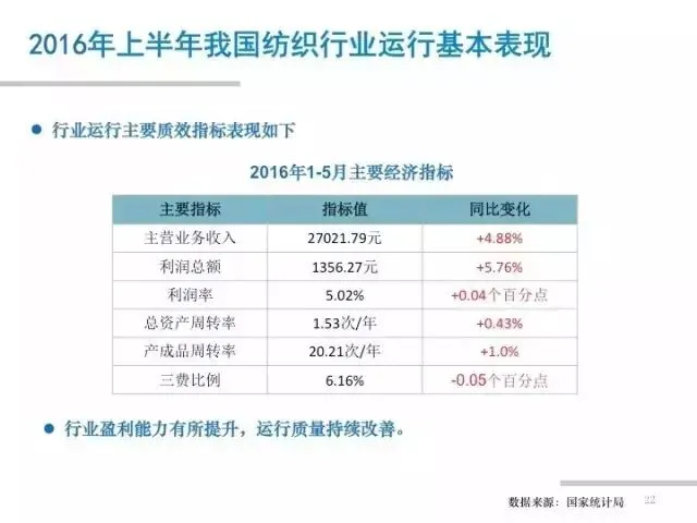 会议指出:2016年上半年,我国纺织行业面临的外部形势仍然严峻,企业成本负担并未减轻,内外市场增长动力偏弱,投资增速下滑明显。但纺织行业坚持加快推进转型升级,着力深化供给侧结构性改革,产销、效益等主要指标实现增长,行业运行基本平稳。