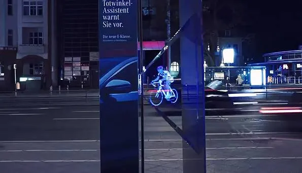2016年4月,保时捷为了宣传新款 911跑车,推出一个全息影像的平面广告,如今这个技术也被德国奔驰汽车拿来用。最近,他们推出了一个户外广告,利用全息影像打造了一辆正在骑行的自行车。而广告牌上写着,奔驰汽车盲区辅助系统为你保驾护航。
