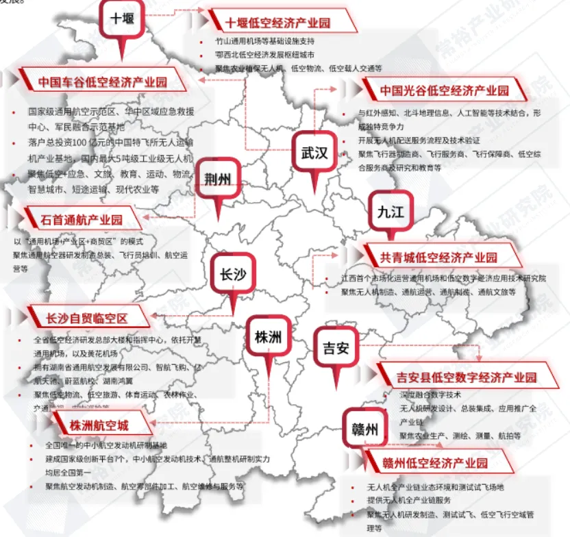 集群崛起加速,探多元新高度。中南地区,在低空经济产业载体上正展现出强劲的动力和广阔的前景。湖南湖北和江西省已拥有9家低空经济产业载体,主要分布在武汉、长沙、株洲、九江、赣州等重要城市。湖南省作为全国首个全域低空空域管理改革试点省份,建成了全国首个可服务全省的3个航空应急救援试点省份之一,拥有AG600大型飞机等先进设备,广泛应用于医疗救助、农林植保、城市治理等多个领域。同时,还涌现出了一批新型航空器,如亿航智能的“EH216-S”载人飞行器、捷特航空的“临空港号”无人直升机等,这些新型航空器的出现进一步丰富了低空经济的应用场景,推动了产业的快速发展。图表:中南地区低空经济产业载体分布图
