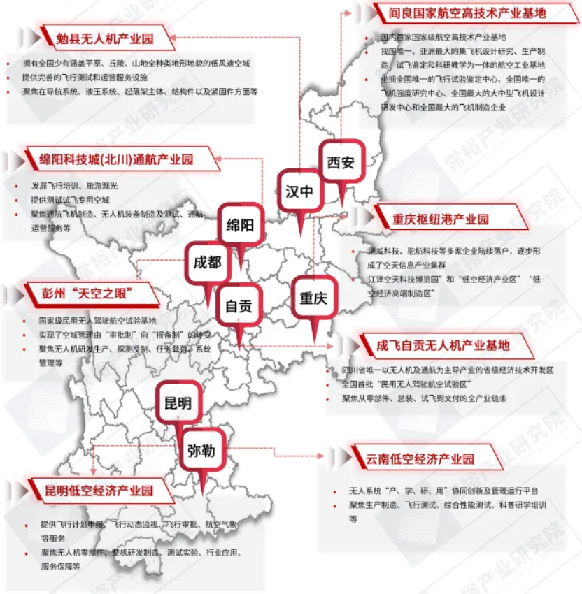 地势赋能助力,推动低空实用经济。西部地区充分利用其独特的地理环境优势,如广袤的山地和高原,为无人机及通用航空产业提供了理想的测试和应用场景。西部地区的低空经济产业园区分布广泛,覆盖了四川、重庆、云南、陕西等多个城市,侧重于无人机测试、农林应用以及低空物流等实用性强的领域,实现了产业的快速发展。目前,西部地区已经形成了无人机及相关产业从研发、制造到测试、应用的完整产业链条,尤其在西安、成都、重庆等地,无人机及相关产业的生态系统已初具规模。图表:西部地区低空经济产业载体分布图