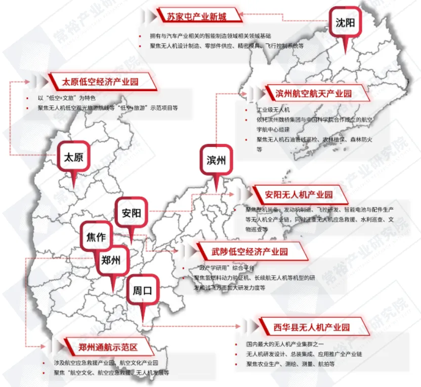 工业基础筑基,育低空新业态。晋鲁豫辽地区成功构建了以无人机、航空制造和通航经济为核心的产业集群。多个低空经济产业园主要集中在太原、郑州、沈阳等城市,并广泛涉足无人机设计与制造、通航运营以及农业应用等多个重要领域。这些产业园区依托当地科研和军工企业,积极推动产学研一体化的发展模式,从而促进了工业无人机技术的快速进步。晋鲁豫辽地区的低空经济产业园区充分利用了当地的传统工业基础,大力发展无人机设计与制造、航空航天零部件生产和智能物流等产业,展现出了显著的成本优势和产业链完善度。图表:晋鲁豫辽地区低空经济产业载体分布图