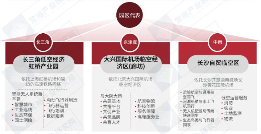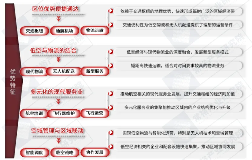 模式特点:充分利用区域的交通和物流优势,特别是临近机场、港口等枢纽位置,发展低空经济、无人机配送和相关现代服务业。图表:区位优势与交通枢纽发展模式及园区代表