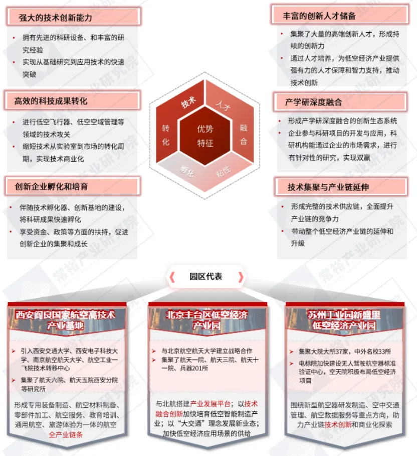 模式特点:依托知名高校、科研机构和重点实验室的创新能力,集中进行技术研发和成果转化,推动低空经济新兴技术的发展。图表:大院大所创新能力的发展模式及园区代表