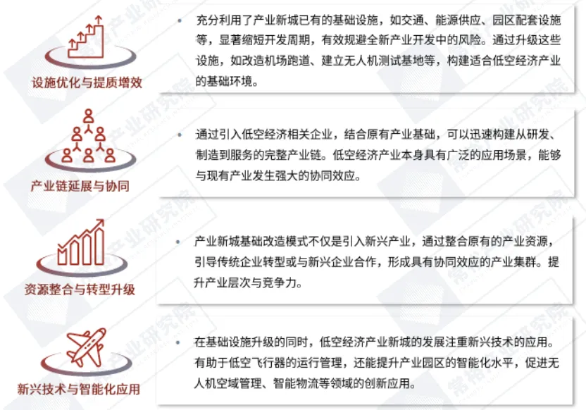 模式特点:通过对原有产业基础的优化升级,引入低空经济相关企业,利用现有基础设施提升产业层次,构建低空经济产业链。图表:产业新城基础改造的发展模式