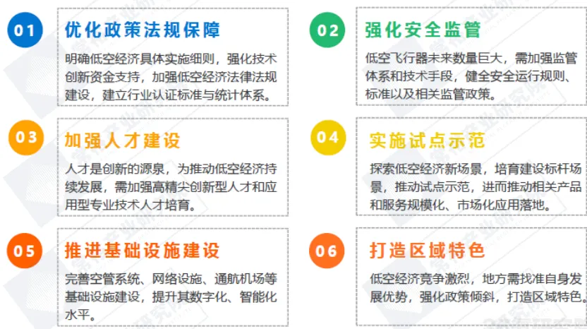 低空经济已成为我国抢占发展机遇、推动高质量发展的重要布局。随着关键技术迭代创新、基础保障不断完善,我国低空经济应用场景逐渐向纵深拓展,各地将找准比较优势,错位加速打造低空经济成为地区经济增长新引擎。(1)前沿技术创新:关键技术迭代创新,核心零部件加速国产替代1)核心零部件:提升主控芯片、传感器等国产化能力;2)关键技术:突破飞控系统、电推进系统、氢能、生物燃料电池等关键前沿技术;3)基础设施:网络基础设施向通感一体、空天地一体化发展,空管系统向信息化、数字化、智慧化转型。(2)应用场景拓展:从载物到载人,从试点示范到规模应用1)无人机:技术相对成熟,从农林植保、地理测绘、巡逻巡检逐步向安防监控、快递物流不断拓展;2)eVTOL:率先落地观光旅游,逐步向UAM、警务安防、国防军事等场景拓展。(3)产业集聚发展:形成长三角、珠三角、京津冀、西三角等集聚区1)长三角:以上海、南京、苏州、杭州及周边等区域为核心,重点发展eVTOL、无人机整机,基础材料及核心零部件;2)珠三角:以深圳、广州、珠海、东莞等城市为核心,重点发展eVTOL、无人机整机,核心零部件,检验检测等保障服务;3)京津冀:以北京为中心,重点发展通信导航等关键系统、芯片等核心零部件;4)西三角:以成都、重庆、西安等为核心,重点发展关键系统、配套服务等。在政策、技术、市场需求等多因素驱动下,低空经济将迎来“黄金发展期”。与此同时,技术安全性、技术创新性、产业链完备度、区域错位发展等方面挑战依然存在。如何在推动行业高速增长的同时,有效应对这些挑战,将是未来低空经济发展过程中需要重点关注的问题。对此,主要建议如下:(1)政策监管方面,加强低空经济法律法规建设,在航空器适航审定、市场准入、安全监管等方面加强研究和谋划,强化技术创新支持,确保低空经济的安全高效发展。(2)产业生态建设方面,通过加强人才储备、基础设施建设及试点示范,为低空经济关键核心技术创新、飞行服务保障、规模应用落地等方面支撑。(3)区域融合错位方面,目前北京、深圳、上海、广州、南京、成都、西安等城市在产业链重点环节已形成一定竞争优势。于后发城市而言,需要找准自身比较优势,并充分融入已有产业链,最终实现在激烈竞逐中的逆袭。图表:低空经济发展建议