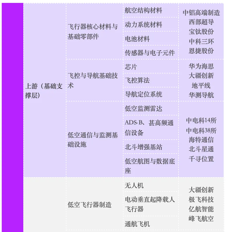 包括航空结构材料、电机与电池材料、传感器、导航定位组件、芯片与飞控算法,以及低空通信与监测设施构成。该环节承担整个低空产业体系的“源头供给”功能,决定飞行器的性能上限、安全底线与数字化基础,并为中游飞行器制造提供必要的结构基础、能源基础与感知计算能力,是低空经济能否安全规模化发展的最关键底层支撑。