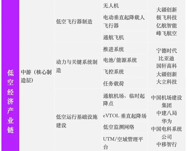 主要由无人机、电动垂直起降飞行器(eVTOL)、通航飞机等整机制造构成,同时包括动力系统、飞控系统、任务载荷等关键子系统集成,并延伸至低空运行所需的通航机场、起降点、Vertiport、无人机基站与UTM空域管理平台等基础设施建设。中游环节承担“技术产品化”的功能,将上游材料、元器件、算法与通信能力进行系统级集成,形成可量产、可运营的飞行器产品,决定整机的成本结构、可靠性与工程化能力。运行设施则为飞行器的交通化与规模化应用提供“运行底座”,使低空经济从技术可行迈入商业可行,是产业链承上启下的核心环节。