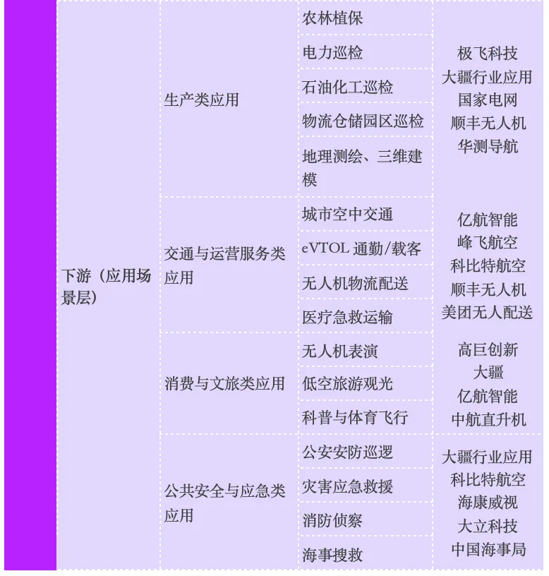 由生产类应用与服务类应用共同构成,覆盖农林植保、电力巡检、石化巡检、测绘建模等行业场景,以及城市空中交通(UAM)、eVTOL通勤、物流配送、文旅观光、无人机表演、应急救援、公共安全等服务化领域。该环节直接面向市场需求,是低空经济商业价值释放的核心载体,决定产业链的市场规模、增长速度与商业模式方向。不同场景对航时、载荷、智能化、安全性等要求的差异,将持续牵引中游产品迭代、推动上游技术演进,形成“需求牵引—供给响应”的动态循环。