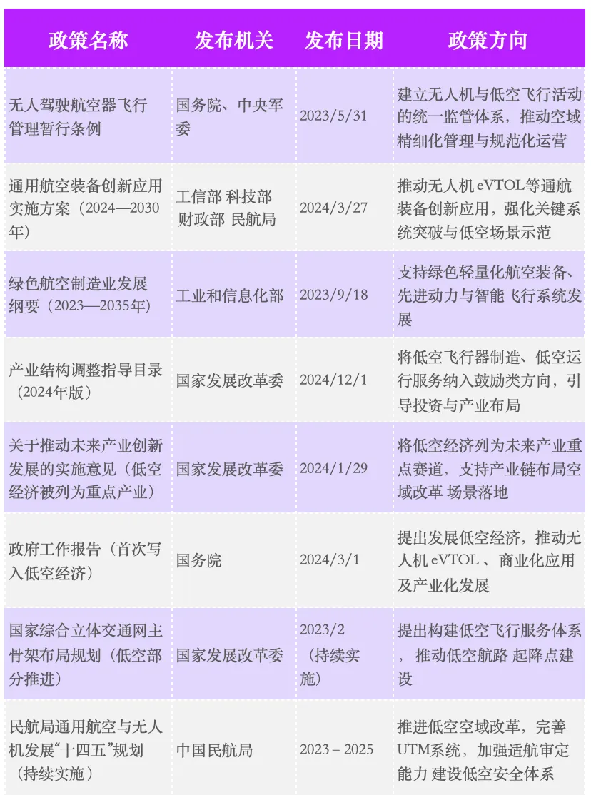 国家层面的政策重点呈现出“空域治理现代化+装备产业化+场景规模化” 的整体方向