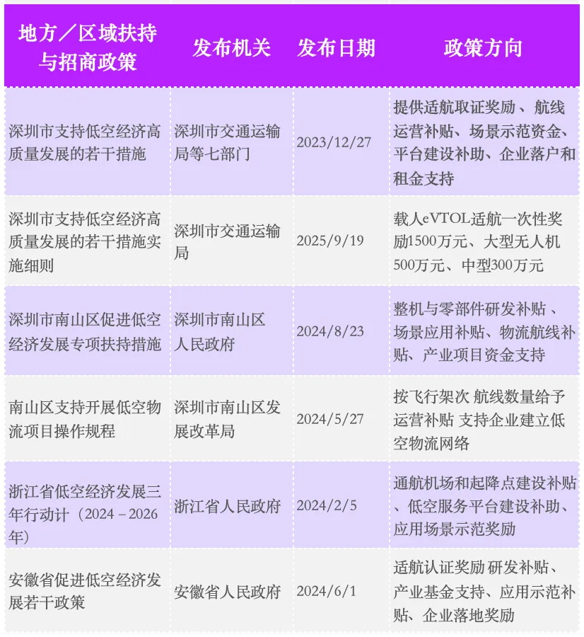 与国家的宏观统筹不同,政策和补贴更偏向“产业集聚+企业落地+应用场景落地”的务实导向,呈现出明显的竞争态势。深圳、广州、成都、浙江等地的补贴普遍聚焦,企业落户奖励、研发投入补贴、适航认证奖励、低空物流和UAM示范航线运营补贴、起降点与垂直机场建设补助、场景开放激励等。一线城市甚至已将载人eVTOL适航奖励(最高 1500万)、大型无人机适航奖励(500万)写入实施细则。地方补贴的核心目的在于,快速形成产业集群、抢占eVTOL与无人机产业制高点,通过资金驱动应用场景率先规模化,从而倒逼产业链上游材料、导航、动力系统等持续升级。总体来看,地方补贴更偏重“企业能落地、产品能量产、场景能跑通”的现实成效导向。