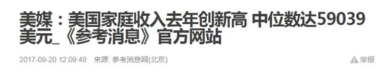 我之前发过一篇文章,叫做《迈向发达国家的最后十年》,是说中国的人均收入在2025年左右会迈入发达国家的最低门槛。我们拿我国2017年的人均可支配收入和美国比较一下,美国《华尔街日报》网站2017年9月12日报道,美国人口普查局12日发布的数据显示,去年美国家庭年收入中位数为59039美元。
