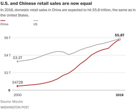 中国人收入在2017年的快速增长,为2018年的消费继续提升奠定了基础,实际上按照2018年1月《华盛顿邮报》的报道,中国老百姓今年的实物商品消费金额预计为5.8万亿美元,将会超过美国。