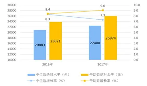 2017年统计公报里面,全国居民人均可支配收入中位数22408元,增长7.3%,这个增速比2016年加快了1个百分点。