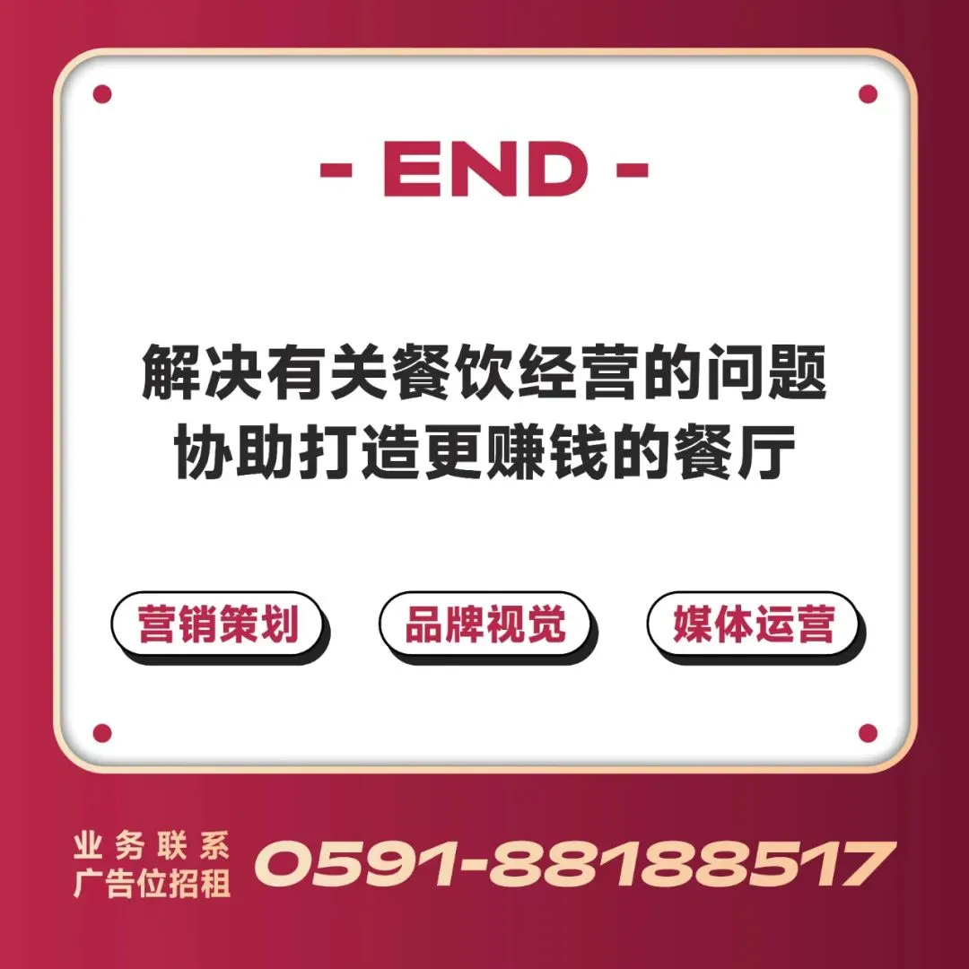 多次获得福州餐饮头部品牌最优合作伙伴、福州餐饮金牌服务商等荣誉,坚持“以市场为导向,以客户为中心”的服务理念,长期为餐饮客户打造可持续性的品牌影响力,共同致力于实现客户利益前行。