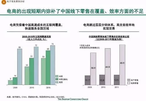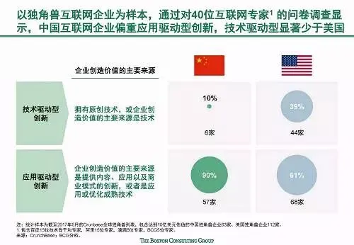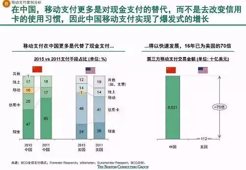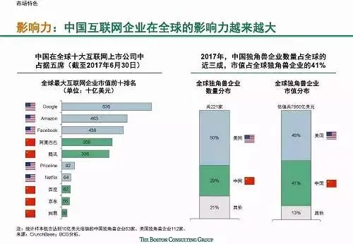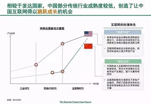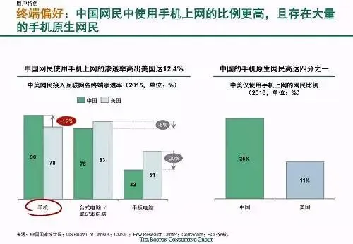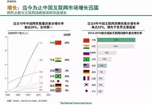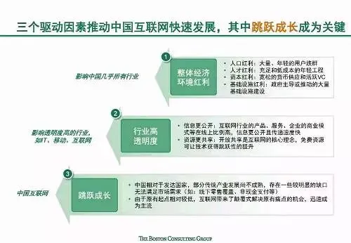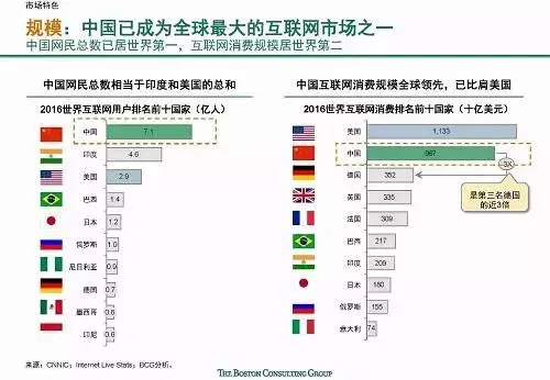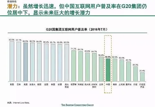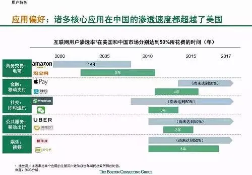 快速发展:中国互联网增长速度全球第一,且仍然有较大增长潜力;中国互联网新应用和服务的普及速度快,诸多新兴应用在中国的渗透速度都远远超过了美国,比如移动支付规模已达美国的70倍。