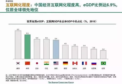 大而独特:中国7.1亿网民相当于印度和美国的总和,互联网程度深,eGDP 高达6.9%,互联网巨头和独角兽在规模和数量上已与美国企业并肩世界前列。