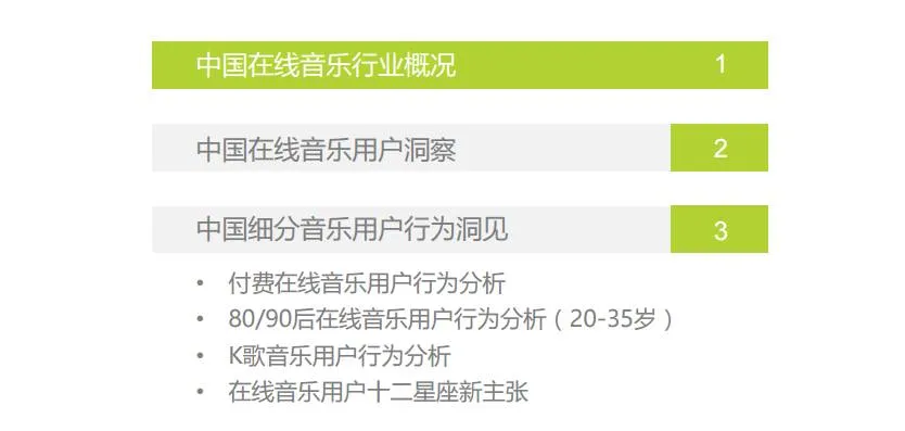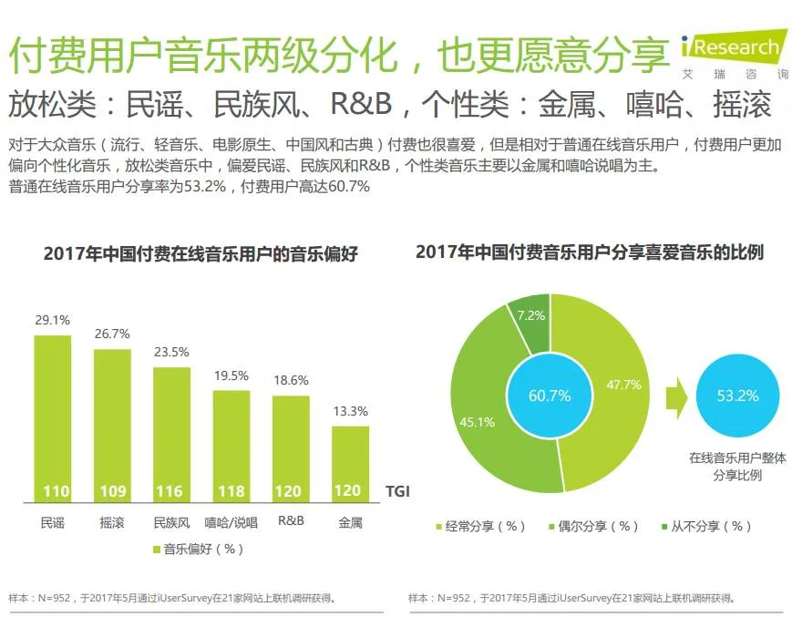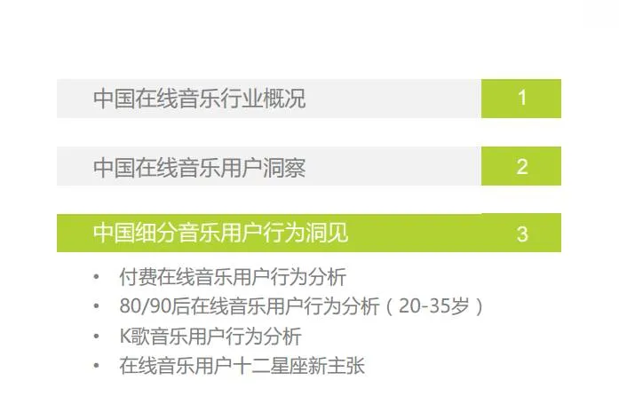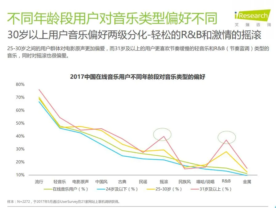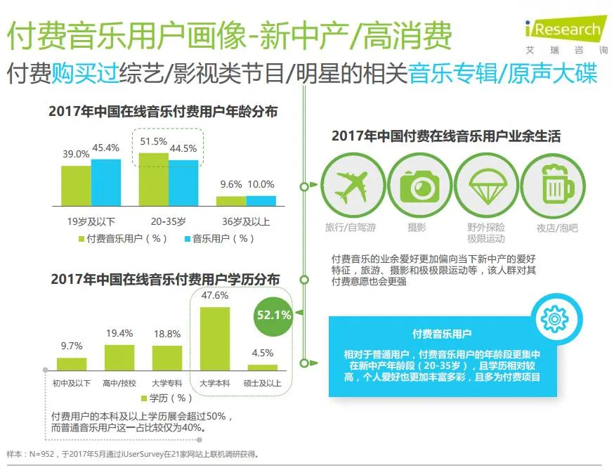 付费音乐用户的年龄段更集中在新中产年龄段(20-35岁),且学历相对较高,个 人爱好也更加丰富多彩;音乐偏好集中在放松类(民谣、民族风、R&B)和个性类 (金属、嘻哈、摇滚)。