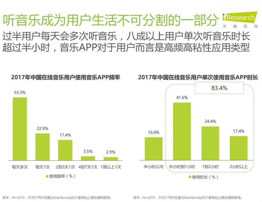 2017年移动在线音乐仍在小幅平稳增长,2017年8月在线音乐月活用户已占到移动端用户的62.7%。过半用户每天会多次听音乐,八成以上用户单次听音乐时长超过半小时,音乐APP对于用户而言是高频高粘性应用类型。