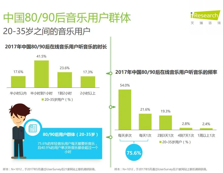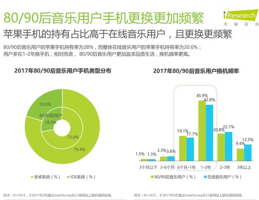 75.6%的80/90后音乐用户每天都要听音乐,且40.9%的用户单次听音乐都会超过 一个小时;80/90后音乐用户更愿意尝试新鲜事物,对于手机等电子产品更换更频繁。