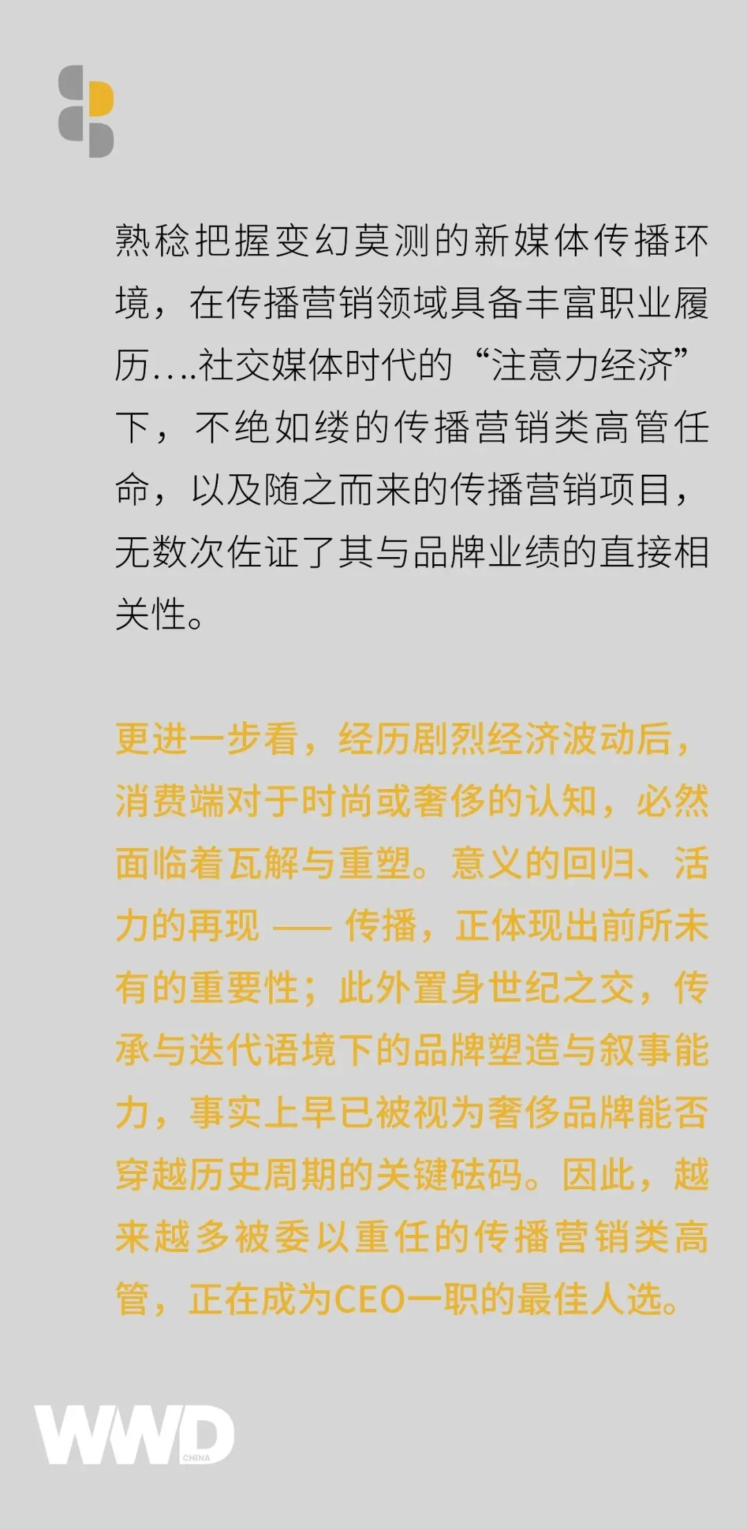 而未来,越来越多拥有丰富传播营销履历等品牌塑造能力的高管,正在担任起越来越多时尚奢侈品牌 CEO 的掌舵者要职;通过内容传播完成品牌塑造,擅于在现代商业世界内实现多元化创意营销,也在呈现出前所未有的决定性作用。