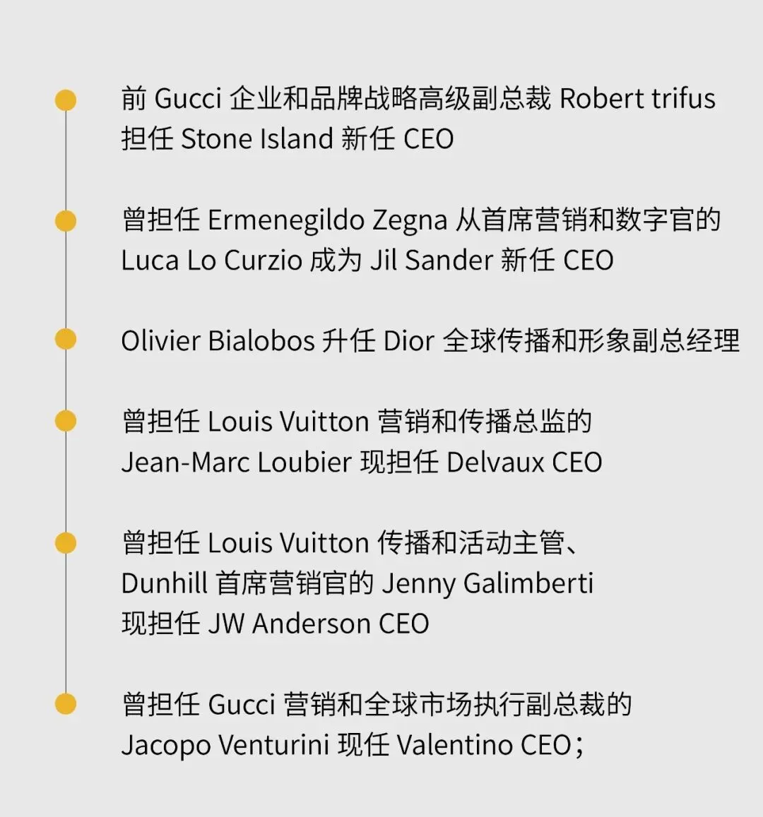 即将担任 Stone Island CEO 的 Robert trifus 就是其中一个。就在一个月前,他刚刚辞去了 Gucci 企业和品牌战略高级副总裁一职。前不久被任命为 Jil Sander 新任 CEO 的 Luca Lo Curzio,此前他曾在 Ermenegildo Zegna 担任首席营销和数字官,此后升任为首席执行官。