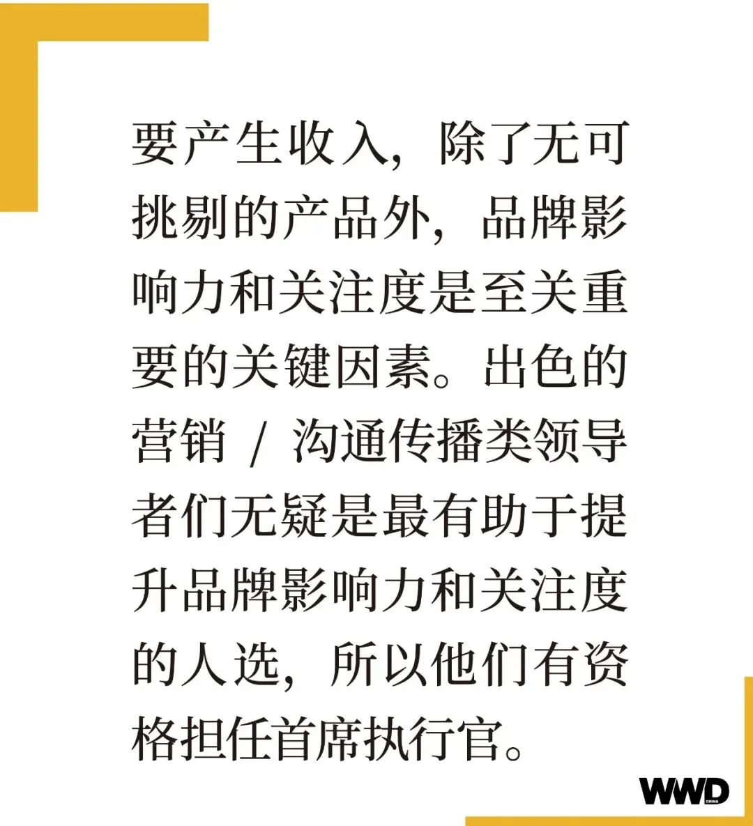 巴黎高管猎头和咨询公司 Floriane de Saint Pierre & associes 的创始人兼负责人 Floriane de Saint Pierre 就向 WWD 说道:“要产生收入,除了无可挑剔的产品外,品牌影响力和关注度是至关重要的关键因素。出色的营销/沟通传播类领导者们无疑是最有助于提升品牌影响力和关注度的人选,所以他们有资格担任首席执行官。”