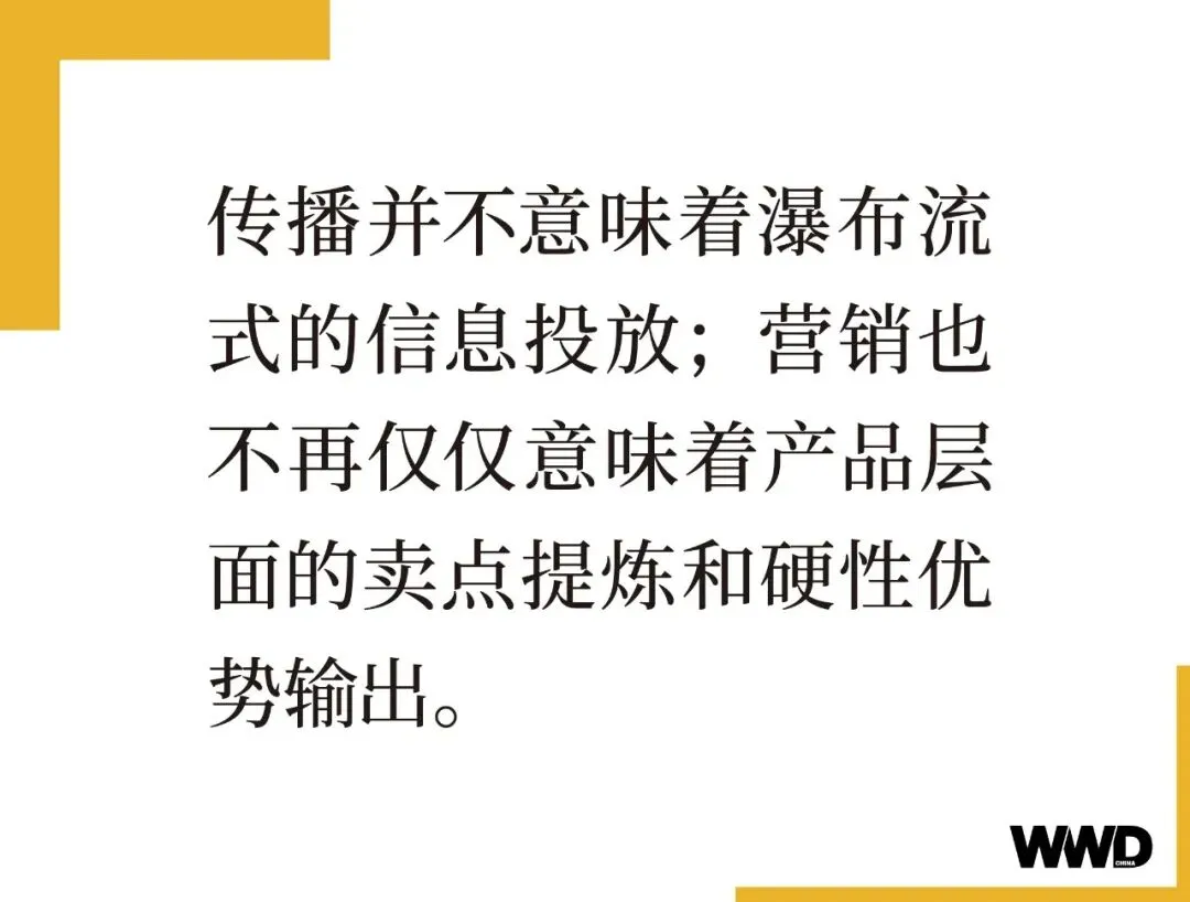 事实上,不论是传播或营销专业领域,或是公司相关高层布局,都并不陌生。但随着消费文化的演变、产业端的升级 —— 传播并不意味着瀑布流式的信息投放;营销也不再仅仅意味着产品层面的卖点提炼和硬性优势输出。