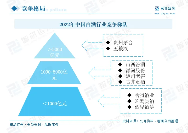 近年来,受新冠疫情影响,我国白酒行业受到一定的冲击,但我国酒业已经进入新一轮产业调整阶段,产业结构、产品结构、市场和消费结构均面临变革与调整。随着白酒产业结构持续优化,品牌不断升级、市场活力有序释放,贵州茅台、五粮液等龙头企业的竞争优势愈发明显,挤压式增长的竞争格局使得我国白酒行业分层越来越明显。按照企业的总市值来分,2022年,我国白酒行业竞争格局大致可以分为三个梯队,第一梯队为总市值大于5000亿元的企业,有贵州茅台和五粮液两家公司;第二梯队为总市值1000-5000亿元的企业,有山西汾酒、洋河股份、泸州老窖和古井贡酒等公司;第三梯队为总市值小于1000亿元的企业,有舍得酒业、迎驾贡酒等公司。