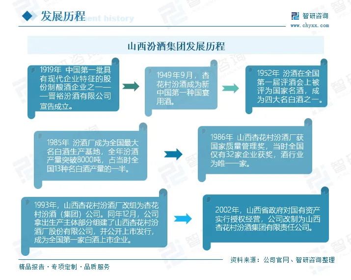 汾酒发展历史悠久,文化源远流长,既是我国名白酒的杰出代表,也是清香型白酒国家标准的制定者,1952年,汾酒在全国第一届评酒会上被评为国家名酒,成为四大名白酒之一。山西汾酒集团经过多轮合并改组,于1993年12月正式组建完成,并在上交所成功上市,成为了全国第一家白酒上市企业。目前,公司拥有“汾”、“竹叶青”、“杏花村”三大驰名商标和11000余亩清香型白酒生产基地,并在山西、东北、内蒙、甘肃、河北等拥有110余万亩原粮种植基地,现有员工15000多名,产品覆盖国内34个省市地区以及美国、英国、澳大利亚、日本等50多个国外地区,拥有超过105万家终端销售网点。