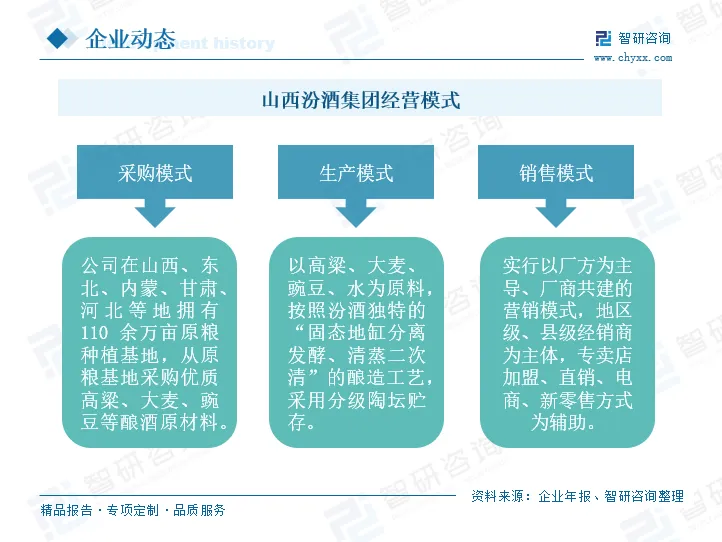 山西汾酒采用研产供销一体化的经营模式,率先在行业内提出并执行与国际标准接轨的食品内控标准,深入分析市场及消费者需求,以消费者需求为研发方向,通过项目方式推进产品开发。在原料采购方面,公司在国内多省拥有绿色原粮基地,从原粮基地采购优质酿酒原材料,实现了从田间到餐桌的全程可追溯,确保产品绿色健康。在产品生产环节,公司严格依照国家相关规定,通过汾酒独特的“固态地缸分离发酵、清蒸二次清”的酿造工艺,采用分级陶坛进行贮存。在销售方面,公司实行以厂方为主导、厂商共建的营销模式,积极布局线上营销渠道,构建立体式营销网络。