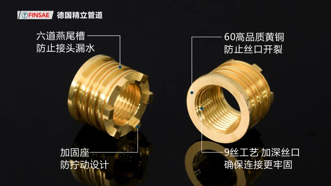 德国精立管件:防开裂,防过拧:高标铜材精密加工,铜件柔韧性、承压性远超同类产品,丝口深度均超过同类产品,避免安装时,因过拧因素导致的漏水,并承诺裂一赔百。防松动,防漏水:铜件燕尾槽紧固结构、热熔处凹槽设计,有效避免因丝口松动、焊接不到位引起的漏水隐患。