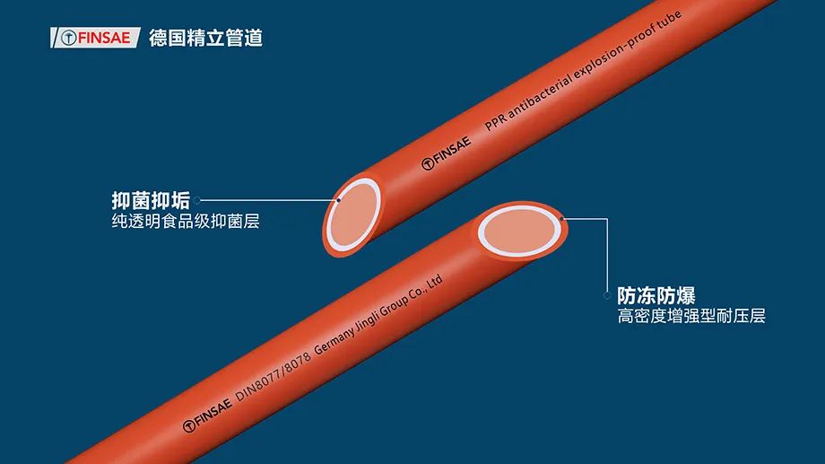 德国精立管道:采用进口纯原料,经无尘生产工艺真空高压一次成形,具有无毒无味安全环保等特点。德国技术,双层共挤:严格执行德国DN8077标准生产,管道分为抑菌层和耐压层,高温高压双层共挤,一次成型,18道生产检测工序,确保品质如一。