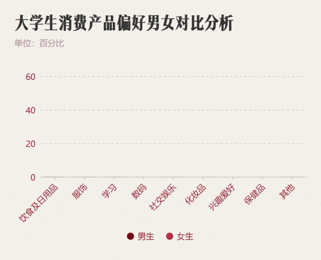 在社交娱乐及保健品消费中,男女生消费习惯差别不大。在饮食及日用品、服饰、兴趣爱好付费中,男生群体的消费率较高于女生;学习类消费中女生群体的消费率较高于男生。在化妆品消费中,男女生消费差异很大,女生消费占比超过5成,而男生消费不足2成。此外,男生更爱数码产品,有近四成男生每学期有过相关消费而女生只有两成。
