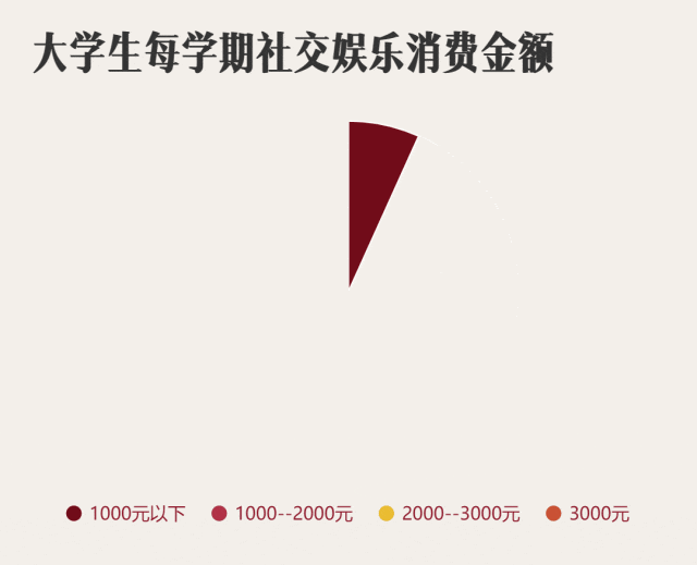 大学生每学期社交娱乐消费金额在1000元以下的占比42%。消费支出在1000元到2000元的占比39.9% 。支出2000元到3000元,占比15.2%。金额超过3000元的,占比3%。