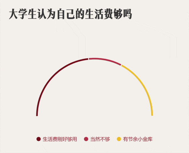 根据数据资料显示,46.8%的大学生认为生活费刚好够用。18.6%的大学生认为现在的生活费不够。34.6%的大学生会在月底还有生活费小金库。