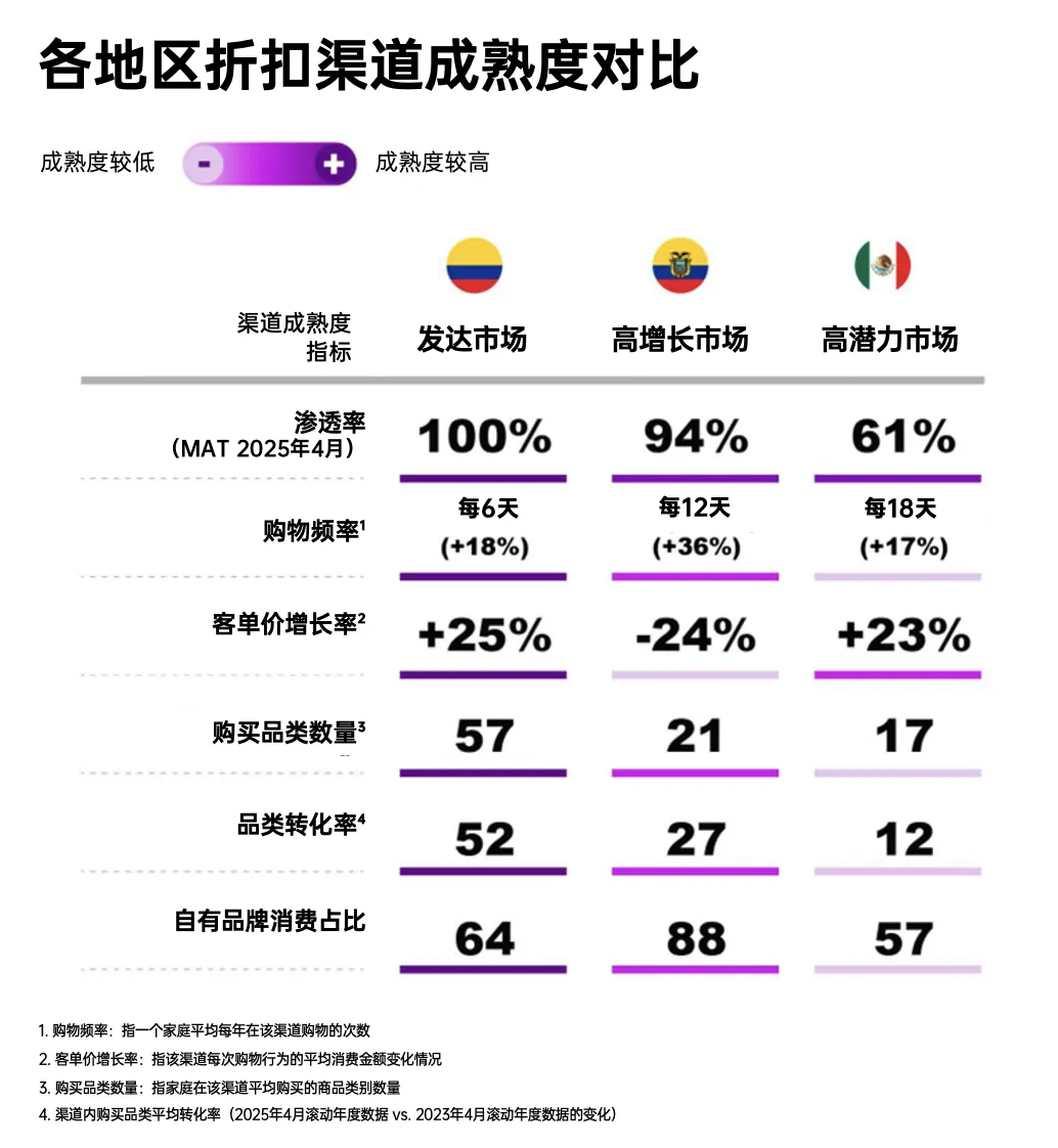 例如,在哥伦比亚,折扣店覆盖了100%的人口,每个家庭年均光顾超过60次,购买57种品类的商品;在巴西,88%的家庭会光顾批发店,其占大众消费品支出的21%。