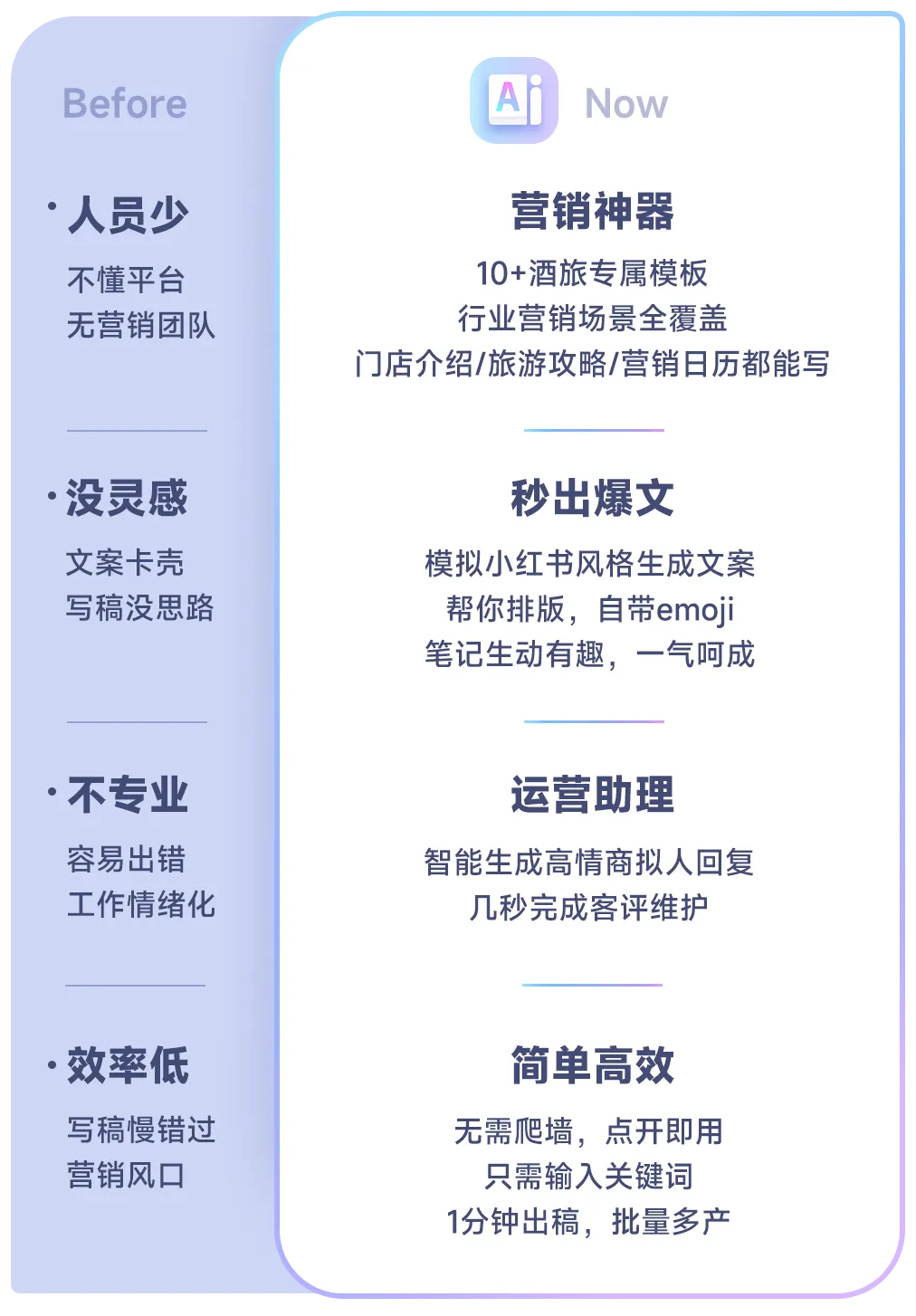 「酒店AI助手」能独立完成文案撰写、排版,并自动插入对应的emoji,并附上相关的小红书标签,一步到位,帮您轻松写出小红书风格的种草软文。