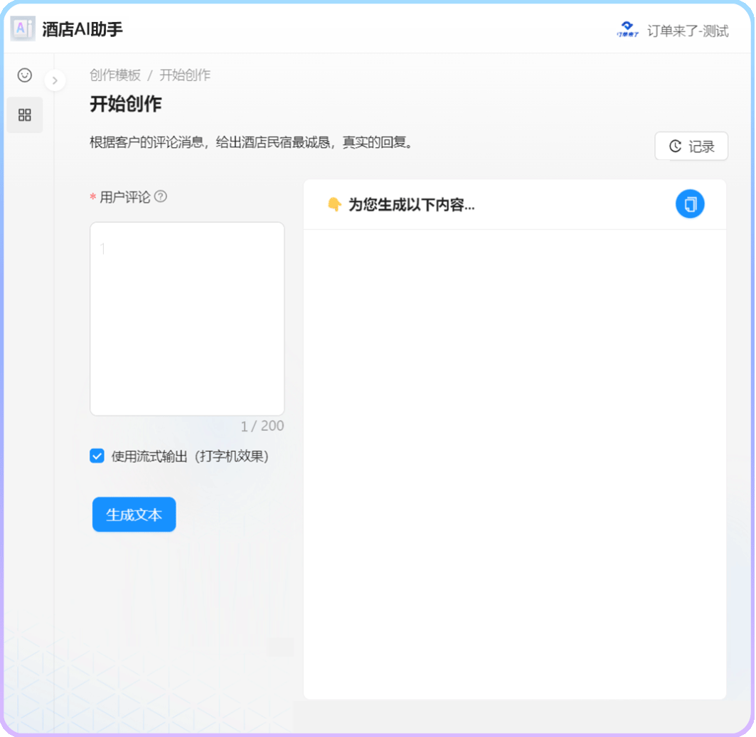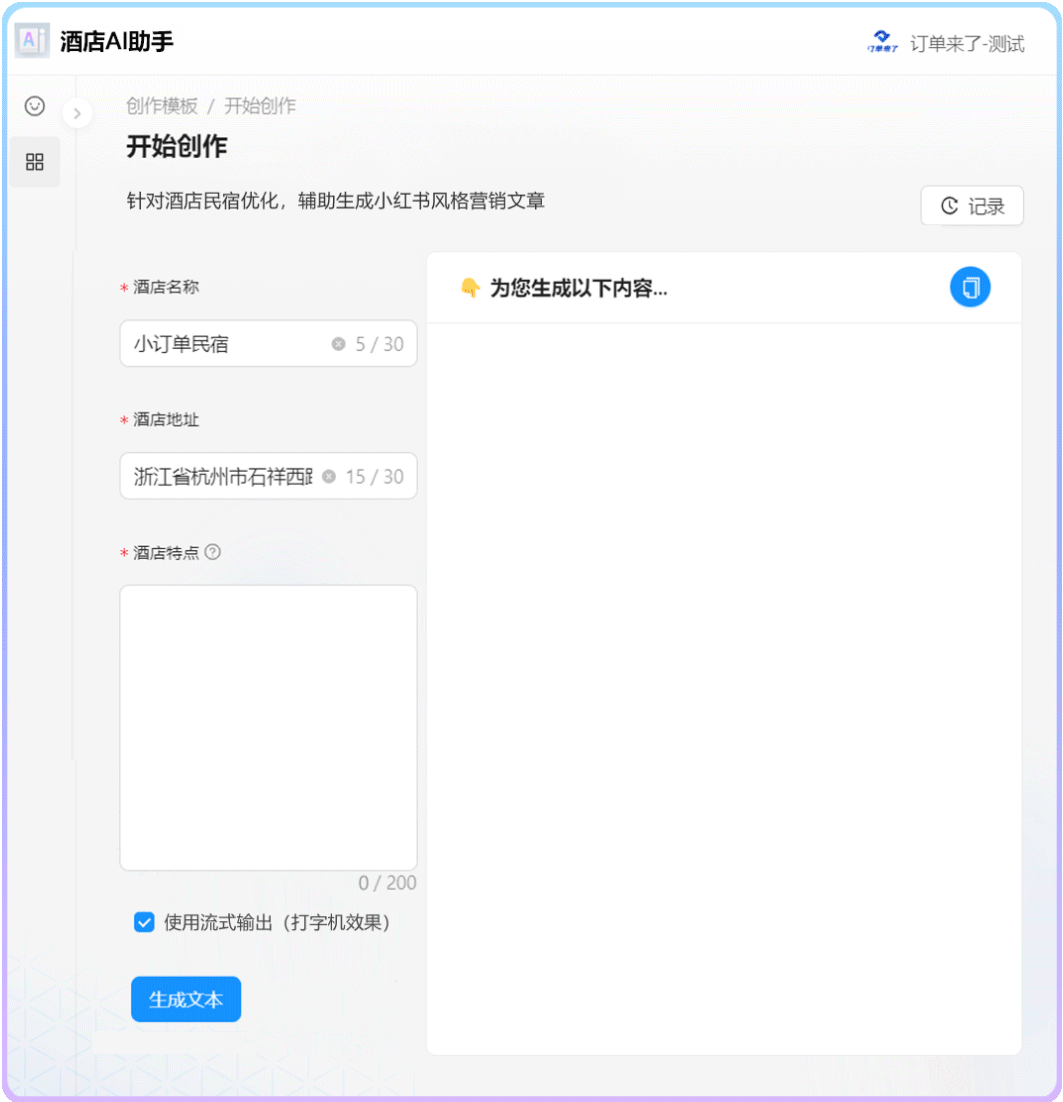这是订单来了针对民宿酒店商家开发的万能营销助手,接入了ChatGPT,并通过上亿级参数的大语言模型(Large Language Model)训练,能够一键生成不同风格营销文案,有效节省人力成本,大幅提高商家营销创作效率。
